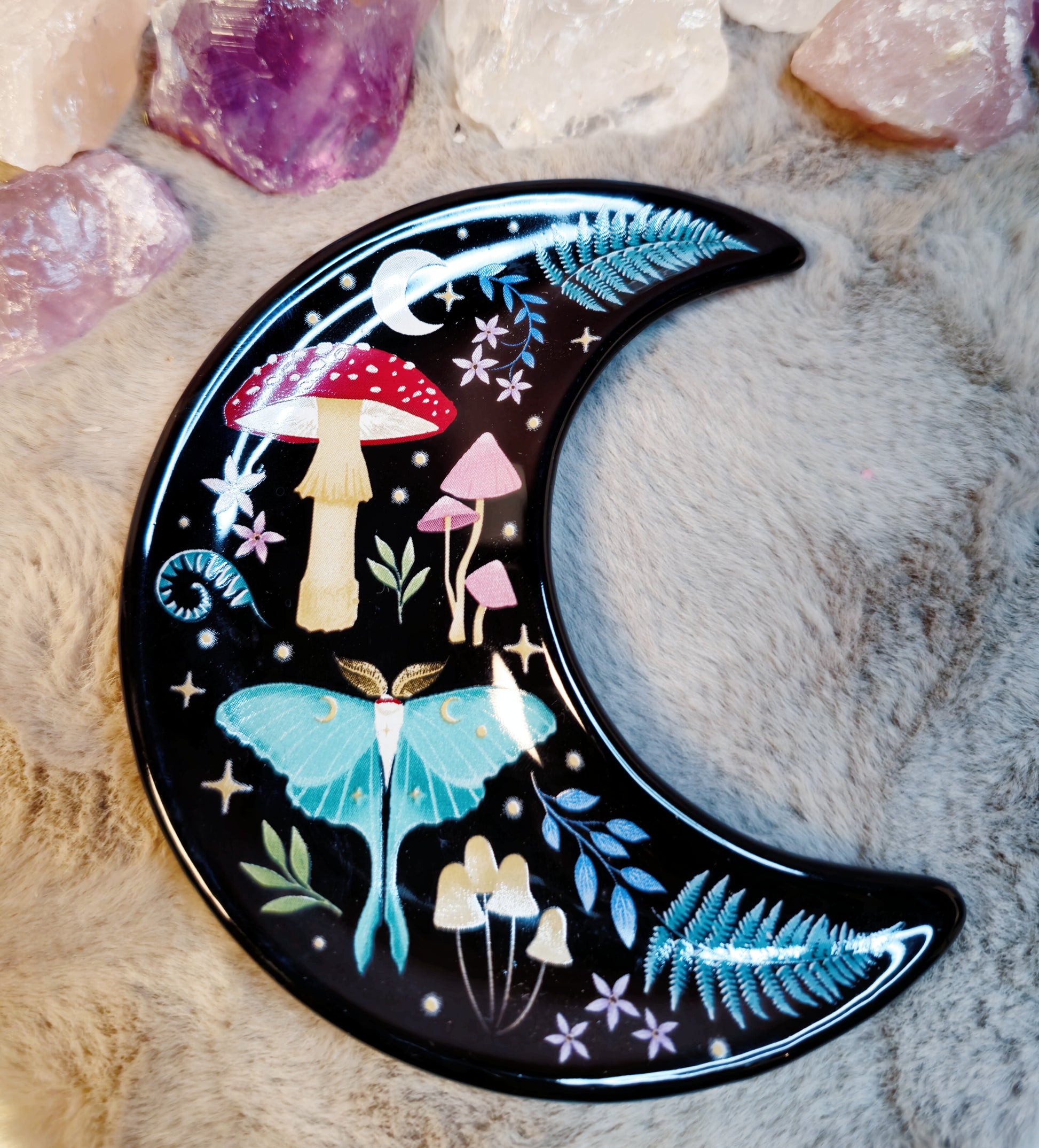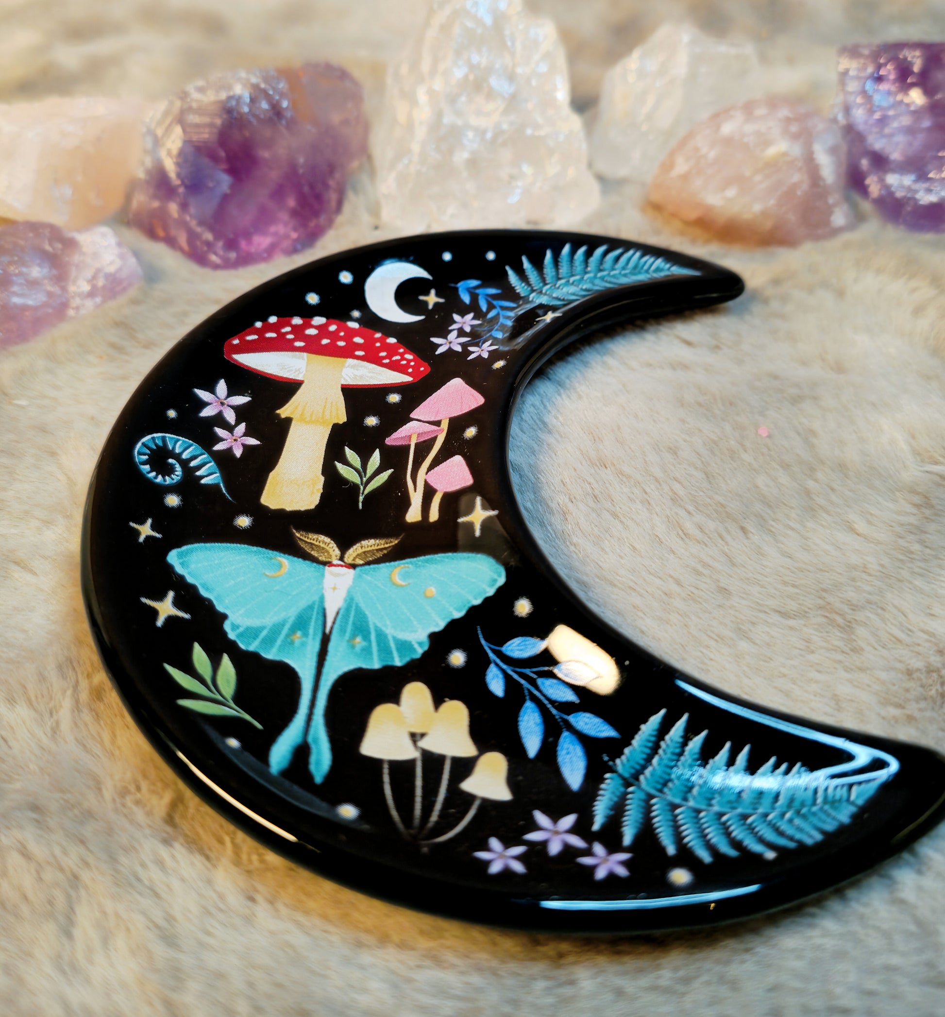 Diese edle Mondsichel-Schale verbindet Funktionalität mit zauberhaftem Design. Das Motiv mit Schmetterling, Mond, Pilzen, Farnen und Blüten lädt dazu ein, kleine Schätze wie Schmuckstücke, Edelsteine oder Räucherutensilien in Szene zu setzen.
